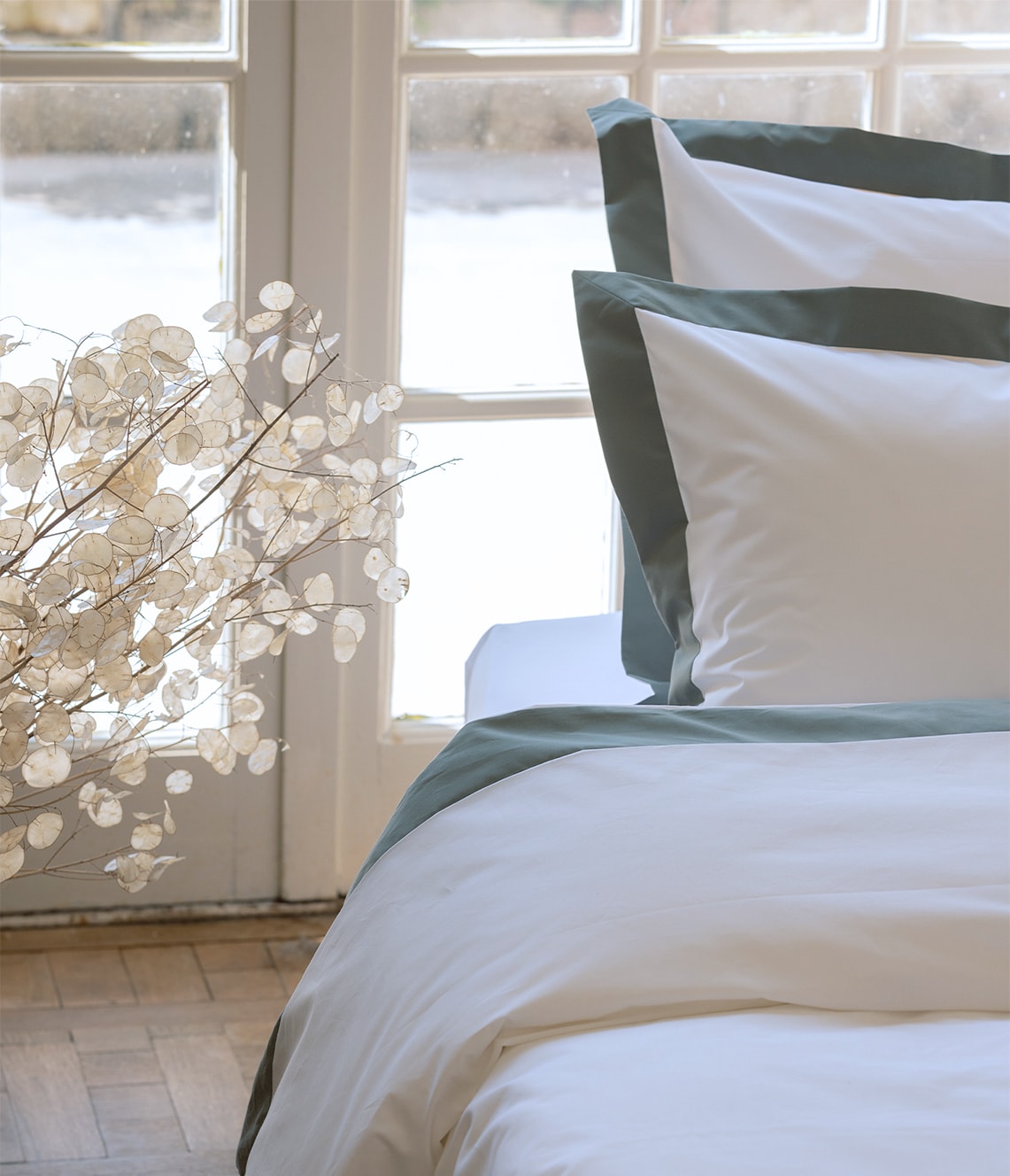L’importance du coeur de la literie — c’est-à-dire la couette elle-même — est mise en valeur par la housse : une belle housse de couette verte magnifie le garnissage et donne du cachet à l’ensemble du linge de lit. Ce choix contribue aussi à la durabilité du produit, en protégeant la couette des salissures et des lavages fréquents.