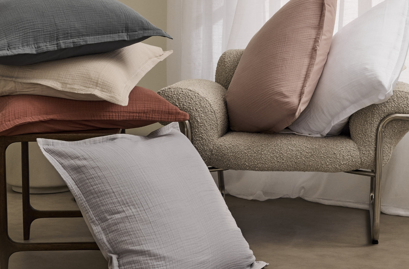 La gaze de coton, c'est avant tout une sensation : légère, aérienne, avec cette texture douce et légèrement gaufrée qu'on ne trouve nulle part ailleurs. Sa double face en fait une parure unique, alliant la douceur texturée de la triple gaze à la fraîcheur lisse de la percale, pour un confort qui s'adapte à chaque saison. Cette alliance des deux matières lui confère une tenue exceptionnelle : elle ne se détend pas et reste impeccable lavage après lavage. Sans repassage, elle se vit avec une élégance décontractée et ses taies ornées d'un subtil volant piqué habillent le lit avec une touche de raffinement discret.